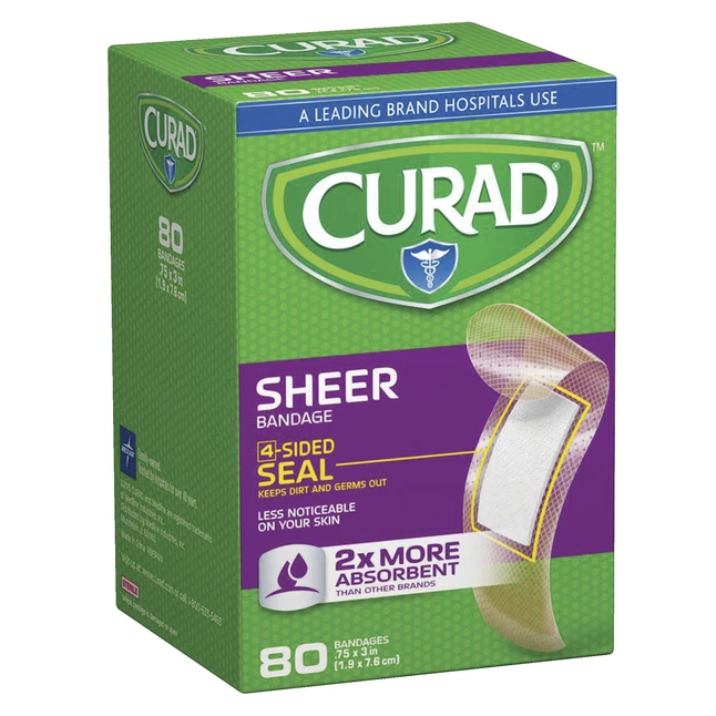 Curad latex free sheer strips are designed to blend with your skin for a more appealing look and help you hide the bandage while you heal. They are also made with a skin-friendly adhesive that doesn’t leave a sticky, itchy residue on the skin. The ouchless island pad comfortably protects the wound from germs and dirt with a four-sided seal. Bandages are latex-free and sterile. Pack of 80.