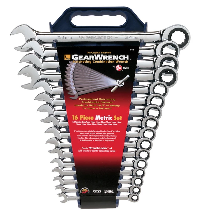 Gearwrench Combination Ratcheting Wrench Metric Set contains 16 wrenches of 8 mm, 9 mm, 10 mm, 11 mm, 12 mm, 13 mm, 14 mm, 15 mm, 16 mm, 17 mm, 18 mm, 19 mm, 20 mm, 22 mm and 24 mm sizes. Full polish, fine-toothed combination ratcheting wrench featuring Surface Drive Plus technology combines the speed of a ratchet and the access capabilities of a wrench.