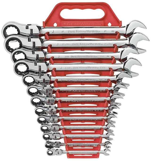Gearwrench Flex Combination Ratcheting Wrench SAE Set contains 13 wrenches of 11/32 in, 5/16 in, 3/8 in, 7/16 in, 1/2 in, 9/16 in, 5/8 in, 11/16 in, 3/4 in, 13/16 in, 7/8 in, 15/16 in and 1 in sizes. Flex head combination wrenches are packaged in a wrench rack.