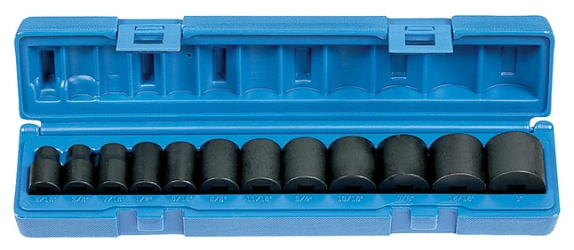 Grey Pneumatic 6 Pt 3/8 in Drive Standard Length Fractional Set of 12 pieces includes 5/16 in, 3/8 in, 7/16 in, 1/2 in, 9/16 in, 5/8 in, 11/16 in, 3/4 in, 13/16 in, 7/8 in, 15/16 in and 1 in sockets.