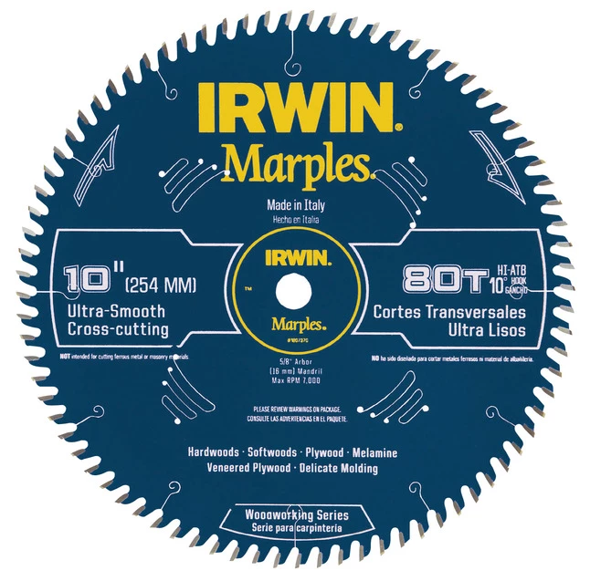 Irwin 10 deg Hi-Alternate Top Bevel Ultra-smooth Crosscutting Saw Blade measures 10 in x 80t and features heat-resistant non-stick coating to reduce gumming for easy cleanup, truer and cleaner cuts. It features extra-sharp, oversized carbide teeth which are re-sharpenable to provide magnificent durability. It is precision tensioned to provide flawless cuts.