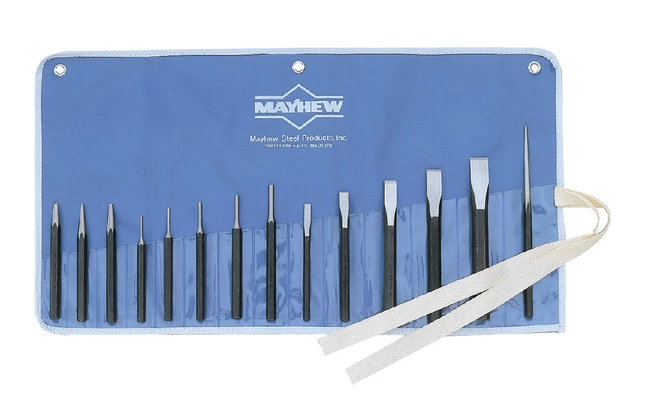 Mayhew 14 Piece Punch and Chisel Kit is used for marking metal, loosening and removal of pins and keys and also shaping and removing metal.