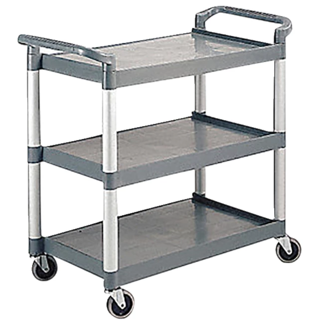 The Grainger Kitchen Utility Cart features handles that are ergonomically designed for transporting a variety of materials. This product also includes swivel casters that provide easy mobility and lipped shelves that prevent items from slipping off while the cart is in motion.