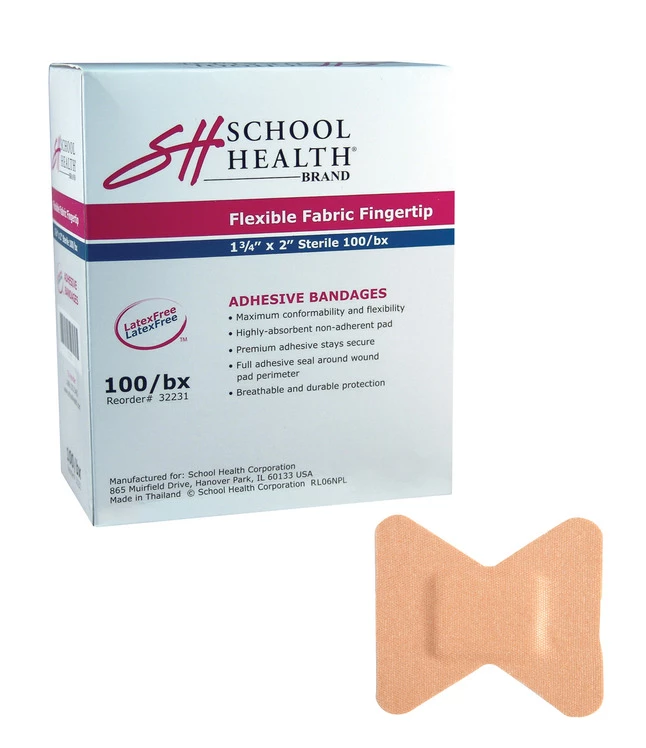 School Health Flexible Fabric Fingertip Strip Bandages have flexibility feature that provides mild compression. The premium adhesive has a multidirectional stretch and stays secure, even with movement or perspiration. They are form-fitting for added comfort, latex-free and highly-absorbent wound pad with 360 degrees of adhesive protection. 2 x 1-3/4 inches. Pack of 100.