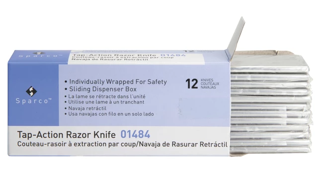 Sparco Tap-Action Knife is refillable with retractable and reversible single-edge razor blades.