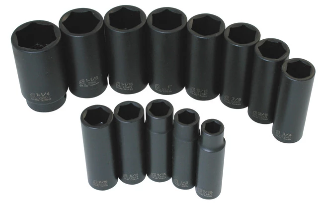 Sunex Intl 1/2 in Drive SAE Deep Impact Socket Set includes 13 pieces of 6-point sockets sized 7/16 in, 1/2 in, 9/16 in, 5/8 in, 11/16 in, 3/4 in, 13/16 in, 7/8 in, 15/16 in, 1 in, 1-1/16 in, 1-1/8 in and 1-1/4 in. This chrome-molybdenum alloy steel provides durability and has a heavy molded storage tray.