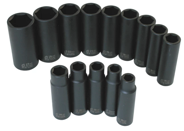 Sunex Intl 1/2 in Drive Metric Deep Impact Socket Set includes 14 pieces of 6-point sockets sized 10 mm, 11 mm, 12 mm, 13 mm, 14 mm, 15 mm, 16 mm, 17 mm, 18 mm, 19 mm, 21 mm, 22 mm, 26 mm and 27 mm. This chrome-molybdenum alloy steel provides durability and has a heavy molded storage tray.